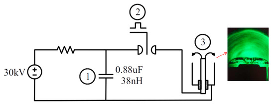 Schematic of plasma focus PF-400J. Operation: ① the capacitor is charged up to 27 kV; ② a signal triggers the spark-gap and ③ the current flows through the coaxial electrodes.