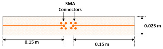 After numerous laboratory tests, a 0.3 m small dipole antenna with a coaxial balun (Figure 3) was implemented as sensor. The final prototype antenna was printed on a circuit board of 0.30 m long and 0.025 m wide. The conductive wire was set to a width of 1.5 mm and both ends were connected to two coaxial connectors that are used as the output of the antenna. It was calibrated with a set of AF which allows the estimation of the electric filed intensity from the voltage signal at the antenna terminals for each frequency of interest. The coaxial balun was used since its response has a linear trend for large electrical fields, due to its composition based on shielded conductors and its absence of coils and magnetic components that can saturate with intense magnetic signals, as occurs with coil baluns and ferrites [24,30]. As described later in this section, the broadband requirements were reached by the use of the AF, which compensate for the frequency response of the antenna.