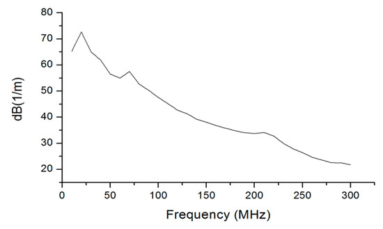 The AF is the ratio between the electric field and the voltage at the antenna terminals for each frequency of interest. The AF for each frequency of interest was estimated through simulation of the dipole antenna by using the High Frequency Structural Simulator (HFSS) software package [31]. The model of the antenna was exposed to a sinusoidal electrical field of specific frequency and intensity. The voltage appearing at the terminals of the antenna was measured and, together with the electrical field used in the simulation, the AF was computed for each frequency. The procedure was repeated in a frequency sweep, ranging from 1 MHz to 300 MHz, producing the results shown in Figure 4.