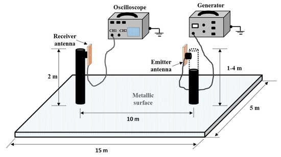 The experimental setup to perform SSM is depicted in Figure 5. The procedure considered an initial measurement phase with two identical 2 m-dipoles with a ferrite balun. This phase was necessary to obtain the AF for the 2 m-dipole in a single measurement, by using a simplified version of the SSM, valid only for identical antennas [27,28]. The final measurement phase, using the standard site method, considered one 2 m-dipole and one 0.3 m-dipole with a coaxial balun. The antennas were separated a distance of 10 m above a 15 m × 5 m metallic plane, which was the greatest surface attainable in our dependencies. The larger the separation between antennas and ground plane area, the better the accuracy of the SSM. The emitter antenna was placed at 2 m height from the ground plane to prevent coupling with the plane, following the SSM configuration which allows the use of the mathematical model for this configuration. The receiving antenna was scanned between 1 m and 4 m to search the maximum signal for each frequency.