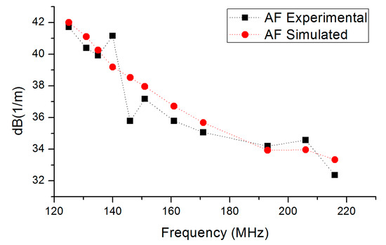 The experimental validation of the AF was made for sinusoids with frequencies ranging from 100 MHz and 220 MHz, imposed by the operational range of our RF generator and the detection of strong enough signals in our oscilloscope. Then, the 0.3 m-dipole was used as receiver and the amplitude of the detected signals were recorded. The AF measured and simulated within the frequency range for the 0.3 m-dipole are shown in Figure 6. When comparing the AF simulated and measured, a very similar behavior was observed for the frequency band analyzed, confirming the validity of the simulation. Thus, we use the measured AF for the range 100 MHz to 200 MHz and simulated below 100 MHz and over 200 MHz (up to 300 MHz).