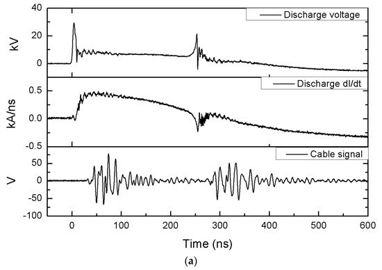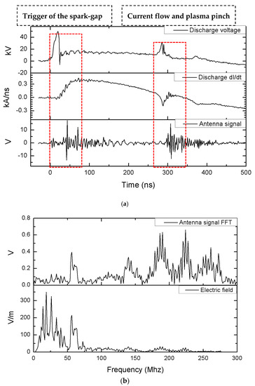 Figure 7a shows as a function of time: the voltage between the electrodes measured with a resistive voltage divider; the derivative of the discharge current registered with a Rogowski coil; and the EMN signal measured by the dipole antenna. All the signals were captured synchronously by the same oscilloscope during a plasma discharge. It is possible to see that despite a difference in the detection time of the order of tens of nanoseconds the antenna probe captures the main features of the electromagnetic burst. The signals have two abrupt transitions: the first corresponds to the breakdown of the spark gap and the gas over the insulator sleeve that covers the anode of the discharge (location 2 in Figure 2); the second corresponds to the moment of maximum compression of the plasma column (called plasma pinch) inside the PF-400J discharge (location 3 in Figure 2).