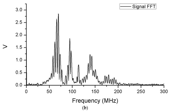 The noise signal and its FFT are shown in Figure 8. The data shows two electromagnetic noise peaks similar to the ones seen in the previous experiment where the 0.3 m-dipole antenna was used to probe the EM noise. The perturbation has an amplitude exceeding 100 V peak to peak and frequency components reaching 200 MHz. The results confirm that the signal is intense enough to cause permanent damage in electronic devices [18,33,34]. The displacements of the spectral components of greater amplitude to higher frequencies occur due to the inductive and capacitive effects of the cable itself. However, the results resemble that shown in Figure 7b, where there was a high spectral content around 70 MHz and the (100–200) MHz band.