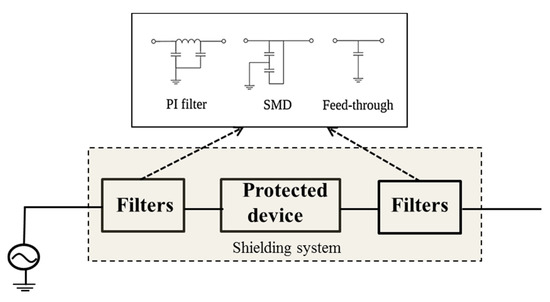 Based on the results obtained in Section 4, a series of filters were selected, in order to obtain attenuation greater than 20 dB between 30 MHz and 300 MHz. Three types of filters were evaluated on the input and output cables of the protected device: capacitive surface mount device (SMD), PI (due to the geometry of its construction) and feed-through [35].