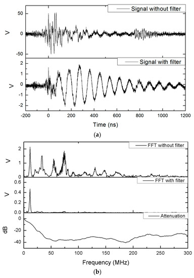 Clearly, an attenuation of the coupled signal of approximately 28 dB is observed compared with the signal without filter. On the other hand, in Figure 11b, a significant attenuation of the spectral power can be observed in the whole frequency band (20 dB), being more significant above 20 MHz. This indicates that both the filter system and the shielding system work properly. In addition, when the protection system was used, no fault was observed when the equipment was put into operation.