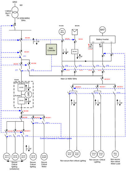 Table 3 shows the power flow control between DES and loads based on the cost of energy. The EMS is designed for three main tariff classifications. When the cost of energy is low and PV generation is available, then all the loads are shared between the utility grid and PV source, and any surplus power is used for charging the UPS and BESS based on their SOC [4,18]. When the cost of energy is medium, the available power from the PV source is completely utilized to serve the load and only for any power requirement deficit, the utility grid is used partially. BESS will also share the loads from the stored energy. During this tariff mode, no power is being used for charging UPS and BESS, assuming there are no surplus power available from DES. When the cost of energy is high, the load demand is shared by the DES as a priority and then partially from the utility grid for the deficit. Since the cost of energy is high, non-critical loads will be removed from the network and will be scheduled to operate later during off-peak time. Also, the critical loads will be operated at optimum power consumption mode to reduce the energy bill, like the cooling system will be operated to exploit thermal inertia without compromising comfort levels along with using natural cooling to the possible extent. During this mode, all forecastable loads will be served as the energy will be preserved in storage devices for the loads based on the demand pattern.