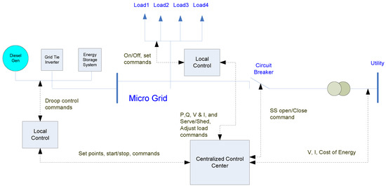 The Figure 1 depicts the microgrid architecture under consideration for an energy management system (EMS). The proposed microgrid system comprises sources like the utility grid, a diesel generator, photovoltaic (PV) generator, and a battery energy storage system (BESS) [3,6]. The loads are classified into secure and non-secure loads [7]. All secure loads are supplied from an uninterruptible power supply (UPS), while the rest of the loads are supplied directly either from the utility grid or from distributed energy sources (DES) [8,9]. All the sources and loads are connected through appropriate circuit breakers. The current and voltage feedback signals from the loads and local feeder lines are fed to the EMS controller. The control signals to circuit breakers are sent from the EMS controller. The input and output data of the EMS is shown in Figure 2. Figure 3 depicts the typical data flow between sources, load and controller. The main controller receives active power, reactive power, voltage, and current data from the local/embedded controller from the DES. Table 1 lists the specification of loads and sources used in this analysis. The cost of energy data from the grid is fed from the utility side. The cost of energy for local generation using DES within the microgrid are fed manually into the EMS for decision-making purposes to achieve economic operation. The user interface of the EMS will allow users to manually enter the specific parameters based on which the power flow decisions to be made. The central database which stores historical load demand, and the actual forecast data will be processed in the EMS for effective load management and power delivery.