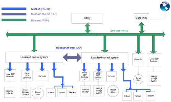 In this paper, a detailed study of a microgrid system has been carried out with the objective to formulate an efficient control algorithm to integrate, manage and control the various power generation sources like PV, DG, BESS, UPS and utility grid with the connected loads. The complexity lies in the smooth transition of load sharing from the PV source to a BESS or the utility grid during the clouding effect on the PV source. Since the penetration of PV sources are on the rise, the intermittency will pose a bigger concern to ensure the stability of microgrid operation during those conditions [27,28,29,30]. This problem was tackled by having coordinated control of PV generation and BESS management for sharing of loads in the network. The authors have proposed a solution to effectively manage the DES and load to achieve stable operation and economic load dispatch in the entire microgrid network [15]. Faster communication topologies were deployed to achieve better response time for the control commands at local as well as centralized controllers. This work can be enhanced by interlinking multiple microgrid networks with a more complex source and load system. The load management and control can be further improvised by using artificial intelligence and optimization techniques as future work. A robust control methodology has been developed and demonstrated in a deterministic way to operate the microgrid network in a sustainable mode. The proposed methodology largely depends on the historical data of load consumption pattern, power generation forecast, and demand forecast.
