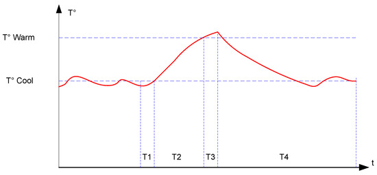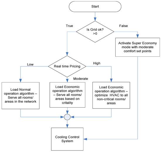 Figure 5 shows the cycle diagram for cooling system load management, where based on the occupancy and temperature sensor input the load will be operated as per the cycle diagram. During time interval T1, the shedding command for the cooling system is activated, which will allow the room temperature to rise, but this will be maintained so as to not to reach the discomfort zone. The entire cooling system will remain shut off during the time interval T2, this is the maximum time interval for shedding affecting the comfort of occupants. During time interval T3, the shedding command will be withdrawn and temperature will start reducing till the cool set limit is reached. T4 time interval is minimum time duration required to restore the comfort temperature level. Equation (4) helps to calculate T2, while the production is stopped: and Equation (5) helps to calculate T4. The main objective of this algorithm is to determine the time interval to attain Tcool after T2 duration, where temperature is equal to Twarm. The flow chart for the cooling system control based on the mode of operation and cost of energy is shown in Figure 6. When the grid is available (Is Grid ok = 1), then the controller will look for the cost of energy, and based on the user set point for high, low and medium cost values through the user interface, the controller will activate the respective mode of operation.