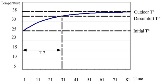 Figure 7 shows the typical cooling load control during time interval T2, where the load will be in off condition. Here the Tcool limit is set to 25 °C, Twarm limit is set to 30 °C, Total thermal resistance Rth = 0.00018 K/W, building time constant τ = 30, with these parameters, the experimental results are confirmed to be 38 min of T2, which means the cooling load was in off state with the occupancy of two people.
