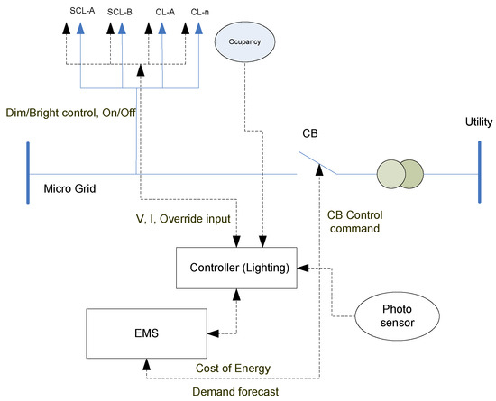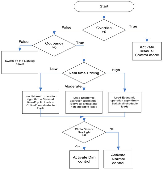Figure 8 shows the lighting system controller. And the Figure 9 shows the control flow chart for lighting load control. The lighting load control algorithm is based on the input from a photo sensor, occupancy sensor and the energy tariff. The EMS also has the provision to override the control by selecting manual mode of operation. If daylight is partially available, then dim control mode will be invoked to reduce the energy consumption. If occupancy is not sensed, then all the lighting loads will be turned off. The lighting controller is designed using the natural light availability from the photo sensor. The optimum required illumination is derived for the total area of surface using the standard lumen method. The availability of natural light is derived from Equation (6). The lighting controller actuator command for illuminating artificial light is calculated from the difference between the required illumination and natural light availability.