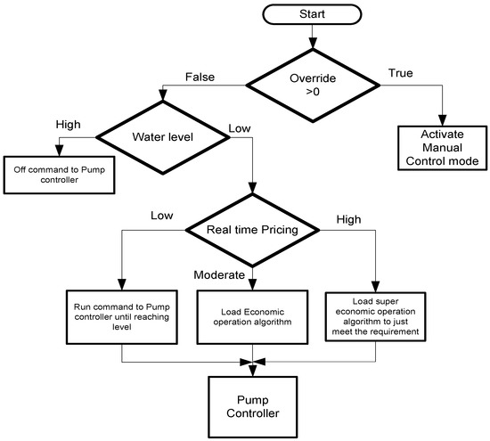 Water pumps constitute a considerable amount of load in a microgrid system. Hence the efficient control and scheduling of water pump control is critical for EMS. The level of water from the storage will be detected using a water level sensor, and this input is compared with the set point of the required level and the error signal is supplied to PID controller, the output of this controller is fed to servo motor and in turn operates the gave valve to increase or decrease the water flow to maintain the required level of water. Normally the set point is derived from the upper level sensor, and there will be a provision in the user interface to enter a manual value to supersede the sensor input limit. Figure 11 shows the control system block diagram for the pump controller. The input to the controller comes from the EMS, and Figure 12 shows the flow chart for the control algorithm based on real time pricing.