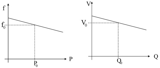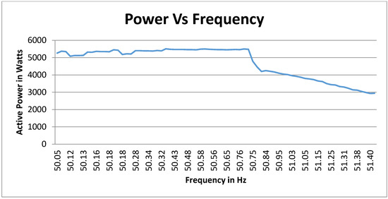 The generic power equation for a generator and corresponding output is given in Equation (7), where Pe is electric power delivered to Load, E and V are generated voltage and terminal voltage at load respectively. is the angular displacement between E and V. From Equation (8), it is understood that, the reactive power (Q) controls the voltage (V), when reactive power increases, the output voltage decreases. Figure 14 shows the relation between frequency versus active power and voltage versus reactive power.
