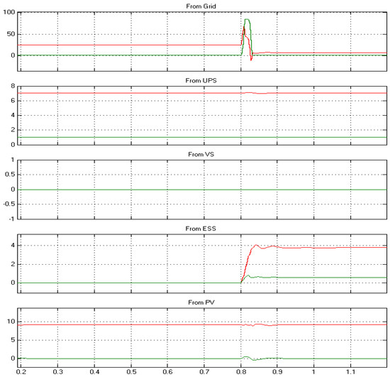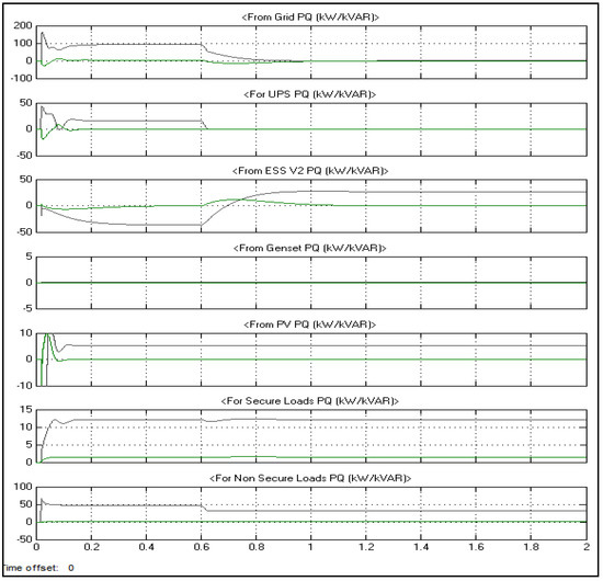 The proposed microgrid network shown in Figure 1 has been modelled in MATLAB/Simulink brick by brick and the simulation results are presented in Figure 15 and Figure 16. In the simulation, all the individual sources and loads are modelled using the Simulink libraries. The sources and loads are integrated and simulated for the different operating scenarios. Figure 15 shows the simulation results of On grid mode. From 0 to 0.6 s, only the utility grid and PV generation sources are supplying the entire load and charging the storage units, at t = 0.6 s, the storage unit started sharing loads by discharging its stored energy, hence reducing power drawn from the utility grid. Initially BESS charge was 77 percentage of its full capacity and UPS was at 80 percentage of full charge. From 0 to 0.6 s, the cost of energy from utility is low, at 0.6 s; the system goes to islanded mode of operation, hence the utilization is optimized to ensure reliable operation. During this entire period, DG is in off condition, and the results are captured for active and reactive power supply from all the sources.