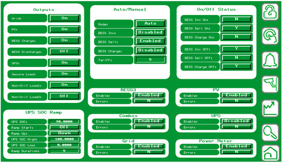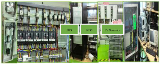 To test and validate the proposed microgrid energy management system, an experimental prototype microgrid setup has been developed comprising a PV generator (25 kW), BESS (10 kW), UPS (8 kW) and utility grid [25]. The control of individual bricks is achieved by a TMS320F28335 programmable digital signal processor chip from Texas Instruments (Dallas, TX, USA). The overall centralized controller was developed using a model M258LF42DT Programmable Logic Controller (PLC, Modicon, Schneider Electric, Reuil-Malmaison, France). For communication between the subsystems, a TSXETG100 (Schneider Electric, Reuil-Malmaison, France) serial to TCP/IP converter communication module is used.