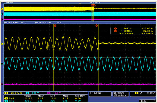To set the parameters, a FDM 121 Human Machine Interface (HMI) has been used (Schneider Electric, Reuil-Malmaison, France). The energy management control algorithm has been programmed in the PLC. To emulate the load conditions, lamp load and resistive load banks were used. Figure 19 shows the experimental set up used for this analysis. Detailed testing has been done to validate the performance of EMS under different load and source operating conditions. Figure 20 shows the active power output from the PV generator in islanded mode of operation. In islanded mode of operation, with the reduction in load, the network voltage will increase. To ensure stability of operation, the active power to be derated for the increase in voltage, if the voltage increases to the cut-off limit, the PV generator to be shut off. Figure 21 shows the control of active power as a function of grid frequency in islanded mode of operation [26]. Under this condition, if the generated power from DES is more than the load demand, the surplus power generated from PV source will be diverted to charge the BESS. Immediately after the battery reaches full charge level, the BESS unit will increase the frequency of its output. On detecting this increase in frequency, PV inverter active power to be curtailed as a function of frequency to follow the predefined gradient. The PV generation will ramp up if the BESS voltage level goes down. The results are in conformance to the design. Figure 22 presents the oscilloscope waveform for under frequency fault condition in islanded mode of operation, at instance ‘a’ the frequency has been reduced to 48.9 Hz, immediately all the loads got shut down command from EMS controller within 120 ms. Figure 23 shows a snapshot of the EMS control screen where the user can activate and deactivate the sources, and loads and change the modes of operation and set the operating parameters.