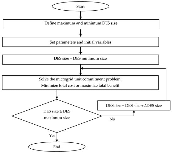 An iterative based method is implemented in [23,24,25,26] to determine the optimal DES size. The microgrid unit commitment problem is solved for different DES sizes within predetermined minimum and maximum values, as shown in Figure 2. The unit commitment problem is solved by implementing dynamic programming (DP) in [23], knowledge based expert system controller (KBES) in [24], mixed integer nonlinear programming (MINLP) in [25], and MILP in [26]. The work in [23] focuses on determining the optimal power rating and energy rating of a Vanadium Redox Battery (VRB), taking into account the nonlinear relationship between the VRB power and efficiency. Different DES technologies are considered in [24] and it is found that the minimum energy cost is obtained when a lead acid battery is installed which makes it the optimal DES technology choice for the considered microgrid. The problem of reserve sizing and DES sizing is investigated in [27]. The authors propose a two-stage probabilistic co-optimization method that determines the optimal DES size as well as the reserve amount that minimizes the microgrid total cost with the consideration of the system reliability. The sizing problem is decomposed into a master problem in which the DES size is fixed and a subproblem in which the optimal reserve size is calculated. The DES size is then updated and the process is repeated. The optimal solution (i.e., the DES optimal size and the optimal reserve) would be the one that minimizes the microgrid total cost. In order to reduce the calculation time, a Markovian steady state analysis is implemented to solve the subproblem and find the optimal reserve value.
