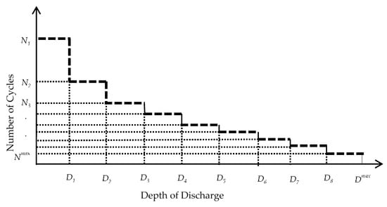 The two main operation factors that impact the DES degradation are depth of discharge and number of charging/discharging cycles. A curve that exhibits the DES lifecycle relation to its depth of discharge is normally provided by DESs manufacturers. An example of this curve is depicted in Figure 3. This relationship can be linearized using Piece wise linearization technique as shown in Figure 4 and used in DES sizing method to model DES degradation.