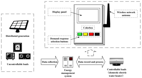In Figure 2, there are four buttons in the Colorbox that can be used to control demand response levels. Users can convey their level of involvement into demand response by selecting different colors. Also, the Colorbox can collect and record the controllable load’s (domestic electric water heater) information, and then deliver it to the energy management system. The energy management system receives information from the Colorbox, uncontrollable loads and distributed energy generators. After that, the management system begins to analyze these data, decide the state of the domestic electric water heater and then send the state back to the Colorbox. Finally, the Colorbox implements the demand to realize the domestic electric water heater control.