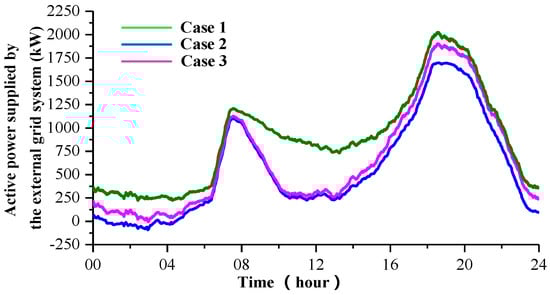 Figure 7 shows the real time active power supplied by the external grid system based on Equation (13). In case 1, renewable power generations (solar and wind) and controllable load are excluded. In cases 2 and 3, renewable power generations have been considered, however, case 2 ignores daily controllable power consumption.