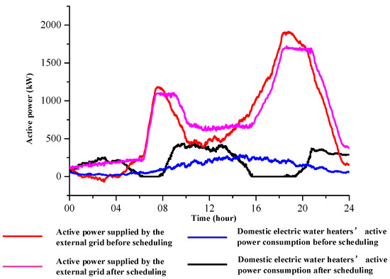 According to cases 1 and 2 shown in Figure 7, the gap between maximum and minimum active power supplied by the external grid system is increased if renewable power generations are available. In addition, cases 2 and 3 indicate that without an appropriate schedule strategy, the access of controllable load (2000 domestic electric water heaters) can enlarge external grid active power fluctuation to some extent. Therefore, it has a great potential to reduce the gap between maximum and minimum active power supplied by the external grid system when domestic electric water heaters are scheduled in a proper way.