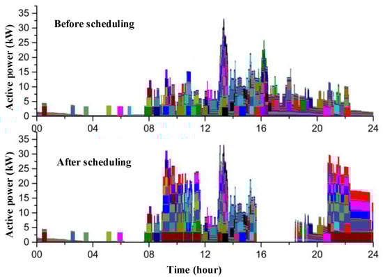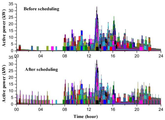 Figure 9 shows the real-time active power consumption of 100 domestic electric water heaters that participate in load scheduling. In Figure 9, the height of each color represents the real time active power consumption of a given domestic electric water heater, and the summit of the curve at a particular time represents the total power consumption of 100 domestic electric water heaters.