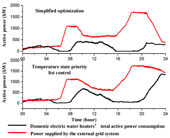 Figure 10 compares the optimization results of the simplified temperature state priority list and the temperature state priority list control strategies. Figure 10 indicates that both control strategies have good performance in suppressing power fluctuation and shaving peak demand for the micro-grid system. Through optimization, these two methods achieve about 12.5% of peak demand reduction. However, compared to the simplified temperature state priority list control strategies, the temperature state priority list method has a wider active power fluctuation range and takes a longer reaction time, which proves that setting the order for domestic electric water heaters can affect scheduling results to some extent.