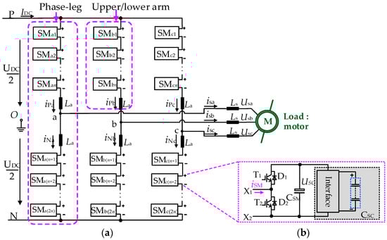 A typical topology for three-phase SCES-MMC is shown in Figure 1, where Ls is the output equivalent AC inductance, o is the neutral point of reference potential between the positive P and negative N of the DC bus. The SCES-MMC is three-phase balanced, and its phase-leg consists of 2n sub-modules SMjk (phase j =a, b, c, SMs number k = 1, 2, …, 2n) and leg inductance La. Figure 1b shows the basic building blocks-SCES-SM, which consists of two IGBTs (T1, T2), two anti-parallel diodes (D1, D2), a capacitor CSM, a super capacitor bank interface circuit.