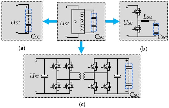 Figure 2 demonstrates three widely-applied topologies for SCES-SM interface circuits: direct connection, bidirectional buck/boost converter and dual active bridge converter. The main difference between the latter two is the isolating transformer. To simplify the analysis, Figure 2a is selected as the SCES-SM interface circuit, but this does not affect the correctness of the theory. Additionally, the distributed super capacitors CSC results in an SCES-MMC with a highly modular structure and redundant capability, which further improves the reliability of the SCES-MMC for mine hoist applications. What is more, the circulating energy of SCES-MMC is exchanged between phase-legs through the common DC bus. Therefore, the SCES-SMs’ state of charge (SOC) may also be applied for system controls.