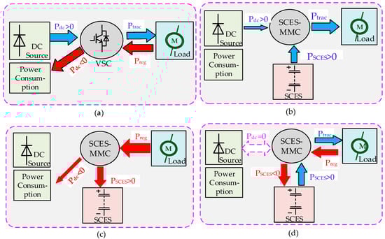 Illustration of power flow: (a) Conventional VSC without SCES; (b) Traction (discharging) condition; (c) Regeneration (charging) condition; (d) Fault operation mode.
