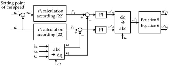 The typical operating states of the mine hoist include acceleration, uniform speed, and deceleration; thus, speed regulation is one of the main control targets. Based on the active flux observer (AFO)-based variable frequency speed regulation control proposed in [22,23], the SCES-MMC VFSR control strategy proposed in this paper is shown in Figure 4, where ω* and ω are the reference mine hoist rotor speed and the observed rotor speed obtained by the active flux observer (AFO) proposed in [22,23], respectively. The reference current i*q, i*d is calculated according to the mathematical model of synchronous motors, as proposed in [22]. Proportional integral regulator PI refers to the current loop controller. Consequently, the upper- and lower-arm voltages and are calculated based on Equations (5) and (6).