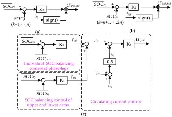 Block diagram of SOC control: (a) Individual SOC control (upper arm); (b) Individual SOC control (lower arm); (c) SOC balancing control.