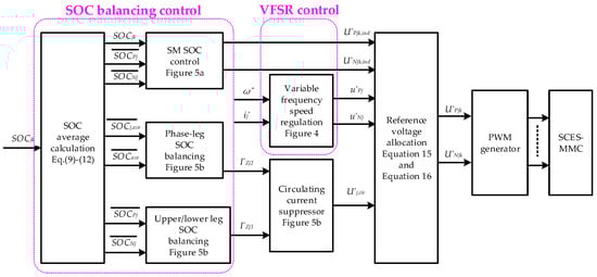 The SCES-MMC operates differently from regular MMCs. Since the SCBs within each SCES-SM are able to act as the DC source for supplying the AC load, the power will be delivered not only from the DC bus but also the SCES. Therefore, the SCES-MMC control strategy, when applied to the mine hoist motor drive system, includes two main parts, namely, motor variable frequency speed regulation (VFSR) control and SOC control.