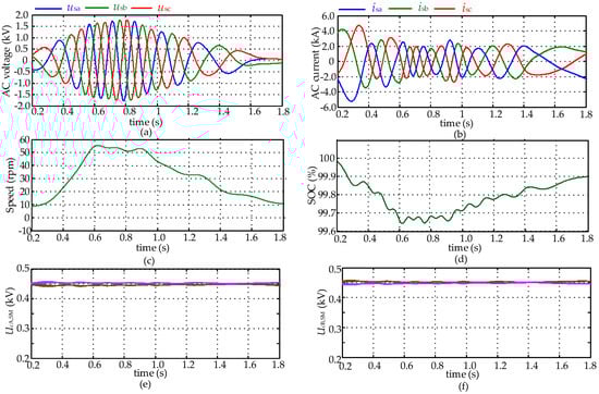 Figure 8a,b shows that the frequency of the voltage and the current will gradually rise to its rated value under variable frequency speed regulation control. The SCES-MMC comes to its steady state at 0.6 s, and then gradually decays when the system enters the deceleration condition at 0.9 s. From the speed characteristics of the synchronous motor shown in Figure 8c, it can be seen that, before 0.6 s, the SCBs begin to release energy when the motor speed is rising and the system SOC is decreasing, as shown in Figure 8d. Then, the motor speed starts to drop when the synchronous motor brakes at 0.9 s, and the regenerative power in this process will also help charge the SCB of each SCES-SM, hence its SOC will rise.