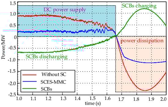 Figure 9 illustrates the power distribution laws of the proposed SCES-MMC. From the above-mentioned analysis, it can be concluded that the SCBs in the SCES-MMC will be discharged to provide about 69% of the AC load power requirement. Thus, less DC power is required compared to those without super capacitor banks. Since SCES is involved in absorbing part of the regenerative power from the mine hoist motor, under regeneration conditions, the power dissipated in the SCES-MMC is also less than for conventional MMCs. This makes it possible to minimize the capacity requirements of the AC grid and energy loss of the mine hoist system.