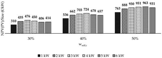 The growth of NPV(PV) is more significant, when there is an alignment between the increase of self-consumption and the increase of plant size. In fact, the values greater for plants with wself,c of 30% are obtained for 3 kW plant (476 €/kW). When the scenario proposed a wself,c of 40% or 50%, or 60%, the maximum NPV(PV) is obtained for 4 kW (724 €/kW), 5 kW (963 €/kW) and 6 kW (1198 €/kW) plants, respectively.