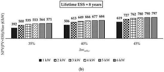 A comparison among several sizes is proposed in Figure 3a,b. It examines the application of the ratio B/S equal to 2.0. These values do not provide results different from previous ones, but underline it as the better performances are verified for 6 kW plant followed by the 5 kW one. NPV/Size varies from 425 to 652 €/kW considering a lifetime of ESS equal to 6 years and from 571 to 797 €/kW with a lifetime of ESS of 8 years. However, 5 kW plant provides the greater increases in comparison to the investment of a single PV plant. They are equal to 239 and 384 €/kW for a lifetime of ESS of 6 and 8 years, respectively. There is only a difference of 1 €/kW than the performance linked to the 6 kW plant. Consequently, these results confirm the opportunity to opt for larger sizes when the demanded energy permits this choice.