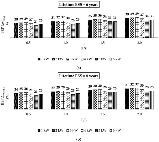 BEP analysis for PV-integrated battery systems (%). (a) is expressed in % with a lifetime EES equal to eight years; (b) is expressed in % with lifetime EES equal to 8 years.