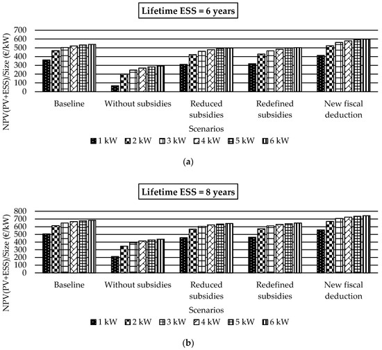 The last step of this work is represented by a comparison of NPV/Size among five scenarios examined. Considering a specific case study (battery capacity double than PV size with an increase of self-consumption of 40%), the best performances are reached with a “new fiscal deduction” scenario for all sizes proposed—Figure 5a,b. The maximum values, in terms of NPV/Size considering a lifetime ESS of six years, are equal to 413, 524, 561, 579, 590, and 598 €/kW in 1, 2, 3, 4, 5, and 6 kW plants, respectively. While, they are equal to 558, 669, 706, 724, 735 and 743 €/kW in 1, 2, 3, 4, 5 and 6 kW plants, respectively, with a lifetime ESS of eight years. Basically, these values are greater than 52–59 €/kW than the ones registered in “baseline” scenarios considering a ratio B/S of 2.0. However, this difference is present also in other case studies with different values of B/S varying from 56 to 71 €/kW.