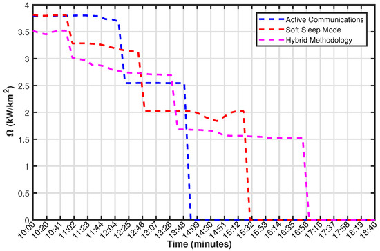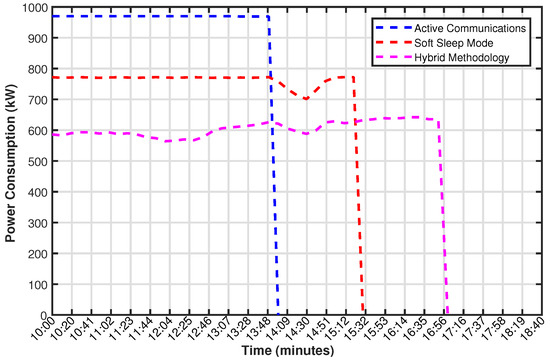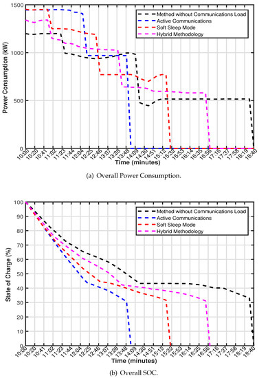 Figure 2a shows the power consumption over time obtained using both the previous methodologies and the hybrid method proposed in this study. The comparison of the results helps to understand the effect of considering the communications’ energy consumption in an islanded operation scenario. In [