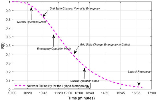 Figure 5, the system reliability can be observed at each operation mode over time. The loss in the system reliability is evident due to the energy saving actions taken by the EMS control, in order to optimize and maximize the supply time. At critical operation mode, the grid has the lower reliability, and it will be not able to perform low and medium latency applications. At this point, the EMS still supplies high priority loads, such as health services and transportation facilities. The base station units are set to long sleep mode to ensure critical microgrid operational requirements and to maximize the supply of critical loads. Therefore, this is the price to pay to extend the operation of the microgrid in islanded mode.