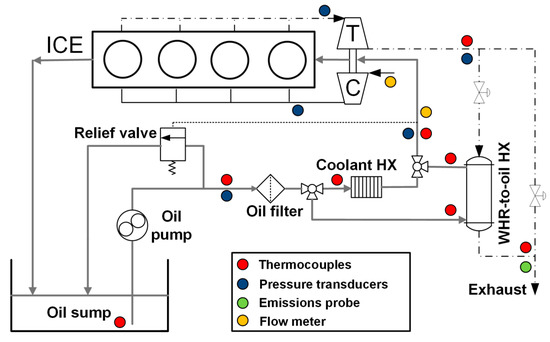 The experimental arrangement of the external engine oil circuit and the position of the heat exchanger on the exhaust gas are shown in Figure 6, where, also, some measurement equipment is placed.