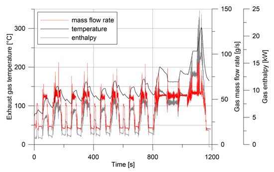Exhaust gas temperature, mass flow, and enthalpy rate for the F1C engine during a NEDC.