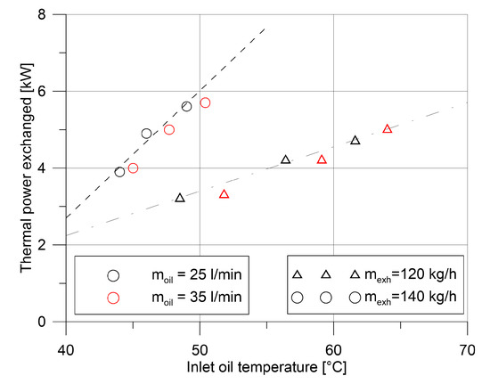 The results of preliminary tests done on the heat exchanger are shown in Figure 4 and Figure 5. Two different exhaust gas mass flow rates have been applied to different temperature and flow rates of the oil flowing in the shell; black points represent tests with oil flow rate equal to 25 L/min, while red ones are for 35 L/min; triangles represent, instead, exhaust flow rate equal to 120 kg/h, and circles 150 kg/h. Thermal power exchanged is in the range of 3–6 kW, and the calculated heat transfer coefficients range from 200 to 250 W/m2·K for the exhaust gases, while it is about 250–300 W/m2·K on the oil side. This results in an overall heat transfer coefficient between 115 and 140 W/m2·K. In Figure 4 and Figure 5, it is demonstrated that it more strongly depends on the exhaust gas flow rate (flowing in the tubes), while the oil flow rate does not show significant influence on the heat exchanger performances.