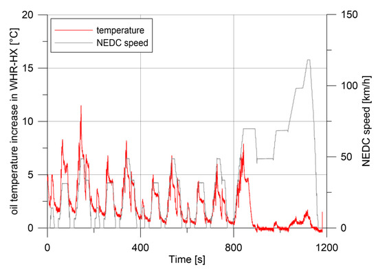 Figure 8 shows the oil temperature increase inside the WHR-to-oil heat exchanger: an average increase of about 2–5 °C is obtained in the first 900 s of the NEDC, with peak of 7–11 °C related to the acceleration phases of the four ECE cycles. This performance can be enhanced by reducing the quantity of the active oil, which passes inside the heat exchanger and then is remixed inside the oil sump during the warm up phase. This can be done by a sump repartition into two chambers: one operating during warming up and a second one which enters in operation when the oil is warmed, ensuring correct life and maintenance time [30]. From 900 s onwards, the WHR heat exchanger is bypassed, and the temperature fluctuations are related only to the temperature of the residual oil on the ducts.
