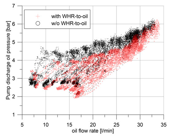 Particular care must be taken in the operation of the oil pump and oil circuit: flow rates of the oil increase (with respect to engine OEM), and the pressure of the oil line increases too. On the contrary, density decreases, and this tends to reduce the pressure. The oil pump working points during the whole NEDC cycle are shown in Figure 10: in all the cases, maximum pressure is 6 bar, which is still compatible with the operation of the lubricating of the engine. At this value, it corresponds to an oil flow rate of about 35 L/min. In the WHR-to-oil case, slightly lower pressures are realized, showing that the oil passage through the WHR heat exchanger has lower pressure drop than the one on the coolant-to-oil heat exchanger (plate type). In any case, the oil pressure at the engine inlet is guaranteed by the control of the relief valve.
