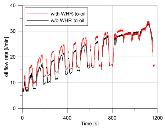 The lower pressure drop, on the lubricant circuit of the WHR-to-oil case, leads to a higher oil flow rate, being the pump of a volumetric type. In fact, in ideal case, the flow rate imposed by pump is linked only to its revolution speed, and it would be the same in the two test cases. In real operation, however, higher discharge pressure of the pump brings lower volumetric efficiency and, therefore, a slightly lower flow rate (Figure 11). In Figure 11, the instant in which the WHR is deactivated and the lubricant circuit is switched to the coolant-to-oil heat exchanger branch is evident also.