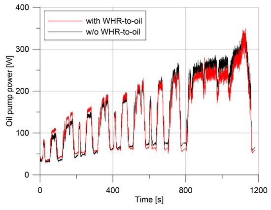 To summarize, in WHR-to-oil case, oil flow rate is higher and pressure drops are lower. The oil pump power requested, therefore, is quite the same in the two test cases performed, as it is shown in Figure 12. A whole energy reduction of 5 kJ is calculated in favor of the WHR case, which represents 2.5% of the energy absorbed by the oil pump in the traditional configuration, but it is negligible if it is reported in terms of engine fuel saved.