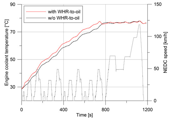 In Figure 7, the temperature of the oil in the sump is registered in the two test cases performed (straight lines). In the reference case (without WHR-to-oil), the oil reaches 80 °C only in the very last part of the NEDC cycle. When WHR-to-oil is active, instead, temperature reaches values about 7–8 °C higher, and it is close to the suitable value of 80 °C after 1000 s. From this point on, WHR is deactivated (i.e., heat exchanger bypassed) and oil temperature in the sump remains about 5 °C higher than the reference case one.