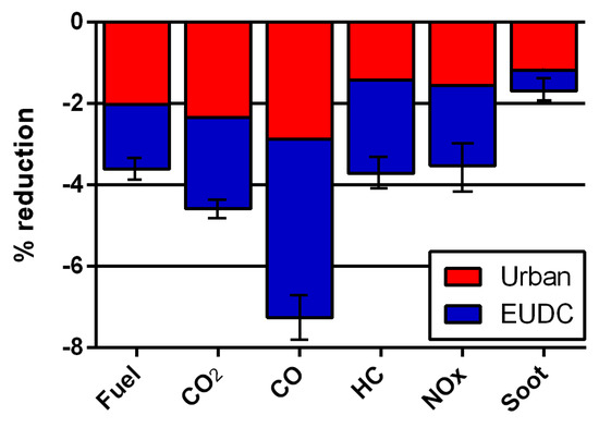 Figure 14 shows the repartition of the measured quantities split in the urban and extra-urban (EUDC) parts of the driving cycle. The urban part is composed of four ECE cycles, for a whole duration of about 800 s, with a length of 4 km. The EUDC part, on the other hand, lasts 380 s and about 7 km. Fuel consumption and carbon dioxide emissions are about half and half in the two parts of the NEDC, while NOx, HC, and, in particular, CO are emitted principally in the urban part of the drive cycle (when the engine and lubricant are colder). Particulate matter (Soot), instead, is mainly produced in the extra-urban part of the cycle.